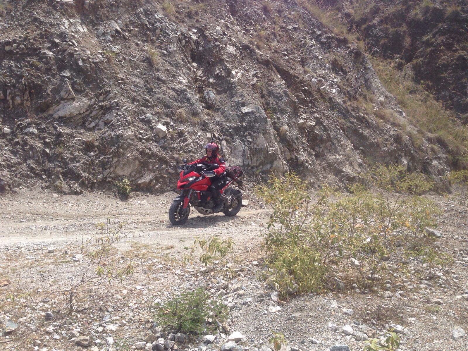 Como se aprecia en la foto arriba, el recorrido era variado. No siempre la dificultad es el mismo barro; en otras ocasiones las piedras sueltas, las subidas/bajadas fuertes hacían la diversión… Pero así fuimos saliendo hacia Guadalupe, a paso lento, con mucha solidaridad entre todos. Y ese fue tal vez el mayor problema. La organización, que buscaba hacer mas ágil el recorrido, estableció en la reunión previa a la salida números para cada piloto y unos grupos que no funcionaron. De esta forma no son 20 los que están esperando en cada paso difícil, viendo como dos pilotos ayudan a un tercero a levantar su moto. Esto debería hacerse solo con los de su grupo de 6 o 7… Afortunadamente, confieso con orgullo, la Ducati embajadora, a pesar del barro intenso, no retraso el grupo ni necesito de mucha ayuda.