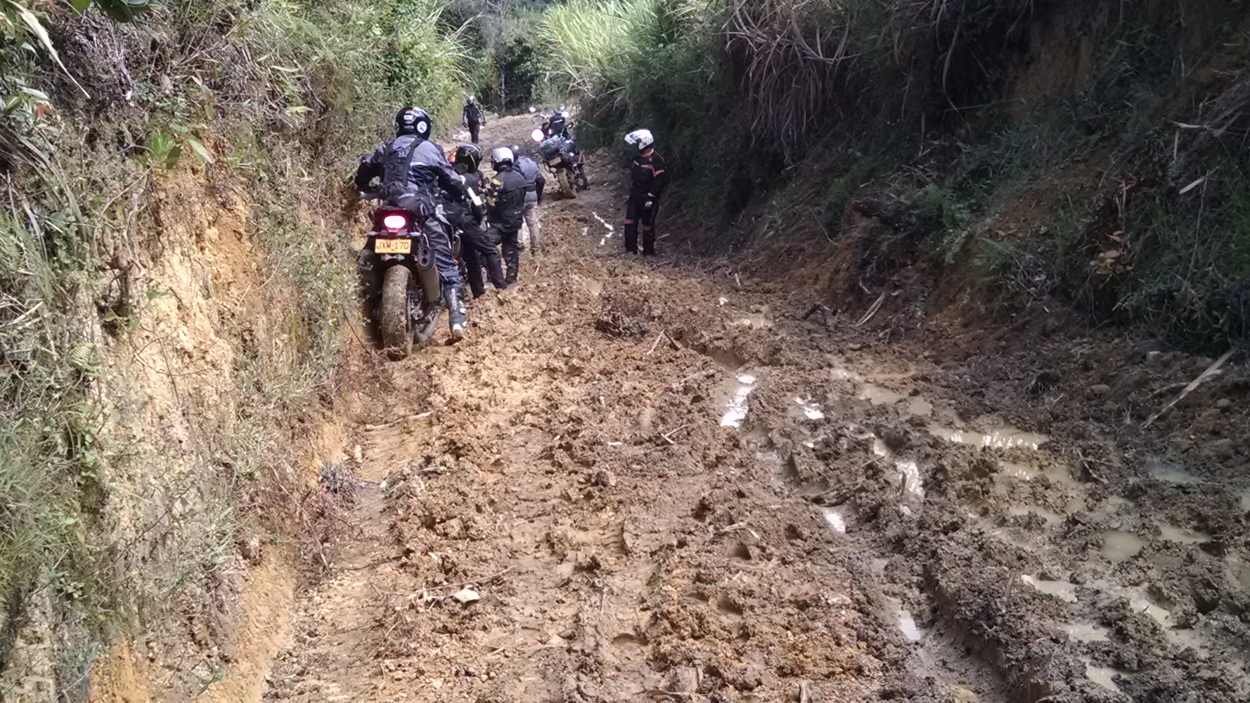 De Barbosa salimos para Vélez, hacia las 9:00 am, todos con ganas de empezar el cuento de los caminos destapados: a lo que vinimos, pues !! Y arrancó la diversión. Lamentablemente la sabrosura no duró mas de una hora, cuando se nos presentó un primer inconveniente: la noche anterior había llovido mucho y una Yamaha Superteneré se complicó con un resbalón sencillo, el cual le produjo un daño serio que no le permitió seguir. Sin embargo, todo el grupo esperó solidariamente por casi una hora o mas para ver que pasaba, hasta que finalmente no se pudo resolver su caso mas que embarcando la moto en un camión rumbo a sus orígenes. Lamentablemente las salidas off-road tienen este tipo de riesgos. Para las motos muchas veces está reservada la peor parte, pues no están exentas de que se le dañe o se les parta alguna pieza en una caída «boba». Es fácil resbalarse en piedra suelta, barro o arena y nos pasa a todos. Pero ese es el riego que hay que correr para llegar a sitios de nuestra geografía, tan espectaculares como el llamado Hoyo del Aire.