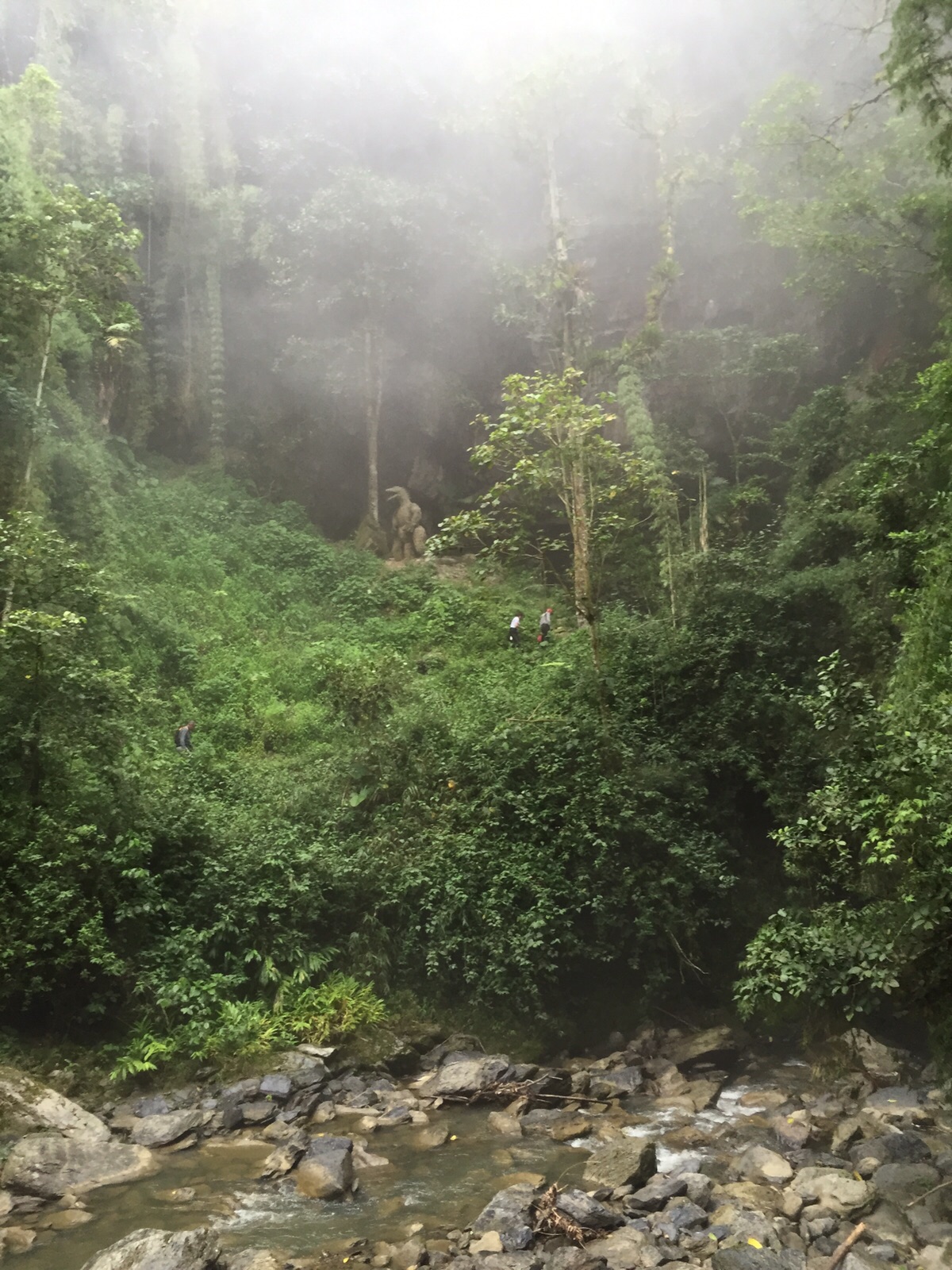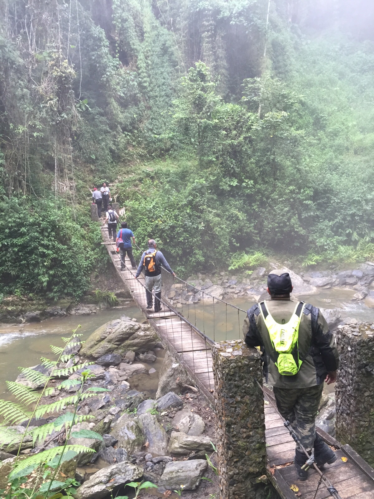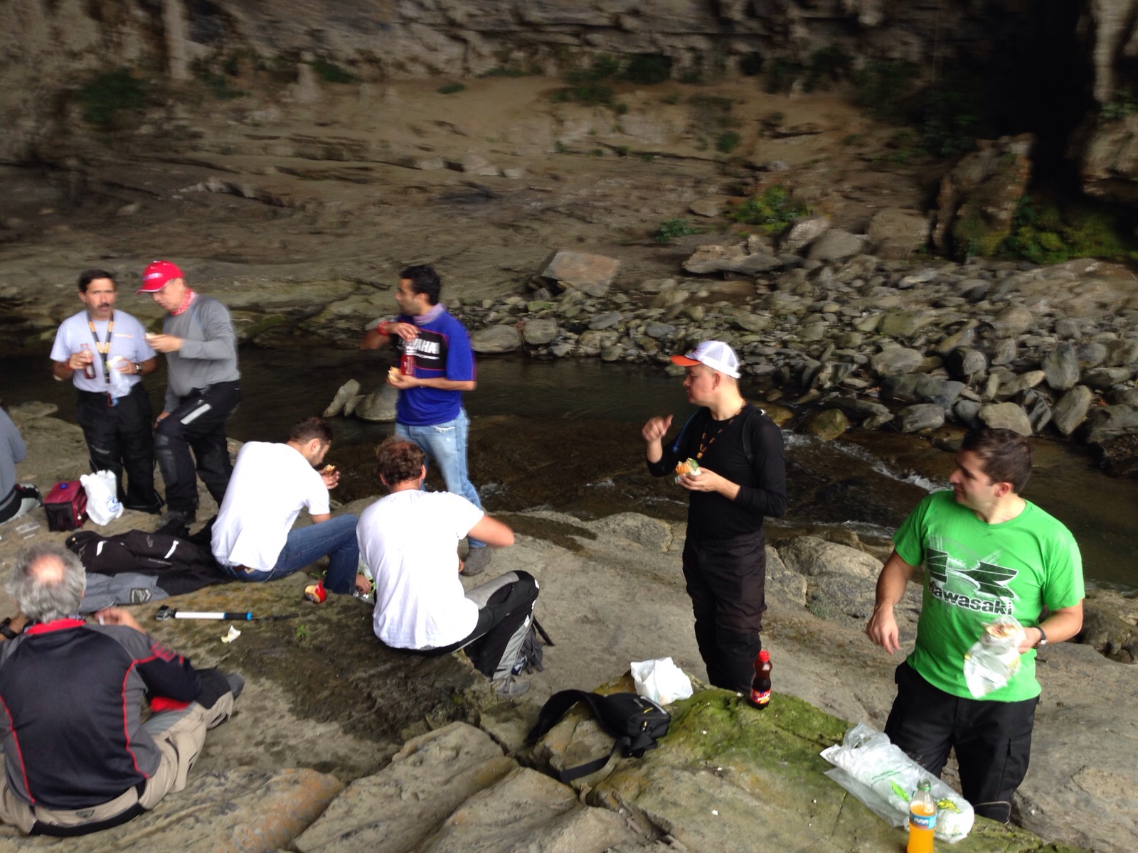 Al llegar a nuestro destino, las motos se dejaron ordenadamente al borde de la carretera, pues esporádicamente pasan otros carros y buses intermunicipales. Tomamos las «loncheras» improvisadas que les pedimos llevar con algo de almuerzo y empezamos una caminata corta para entrar a esta maravilla natural. El río que veníamos bordeando (o mejor, la quebrada, como explicaba arriba) de un momento a otro se mete en la montaña y desaparece. La cruzamos usando un puente colgante, en regular estado, que hace mas emocionante el recorrido.
