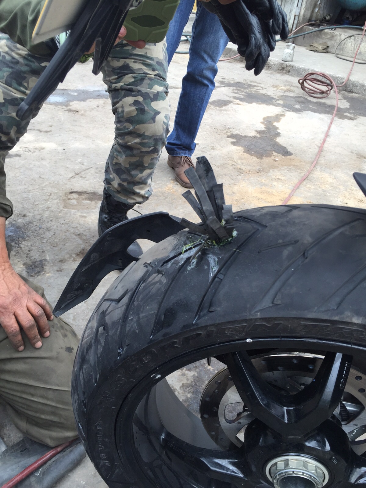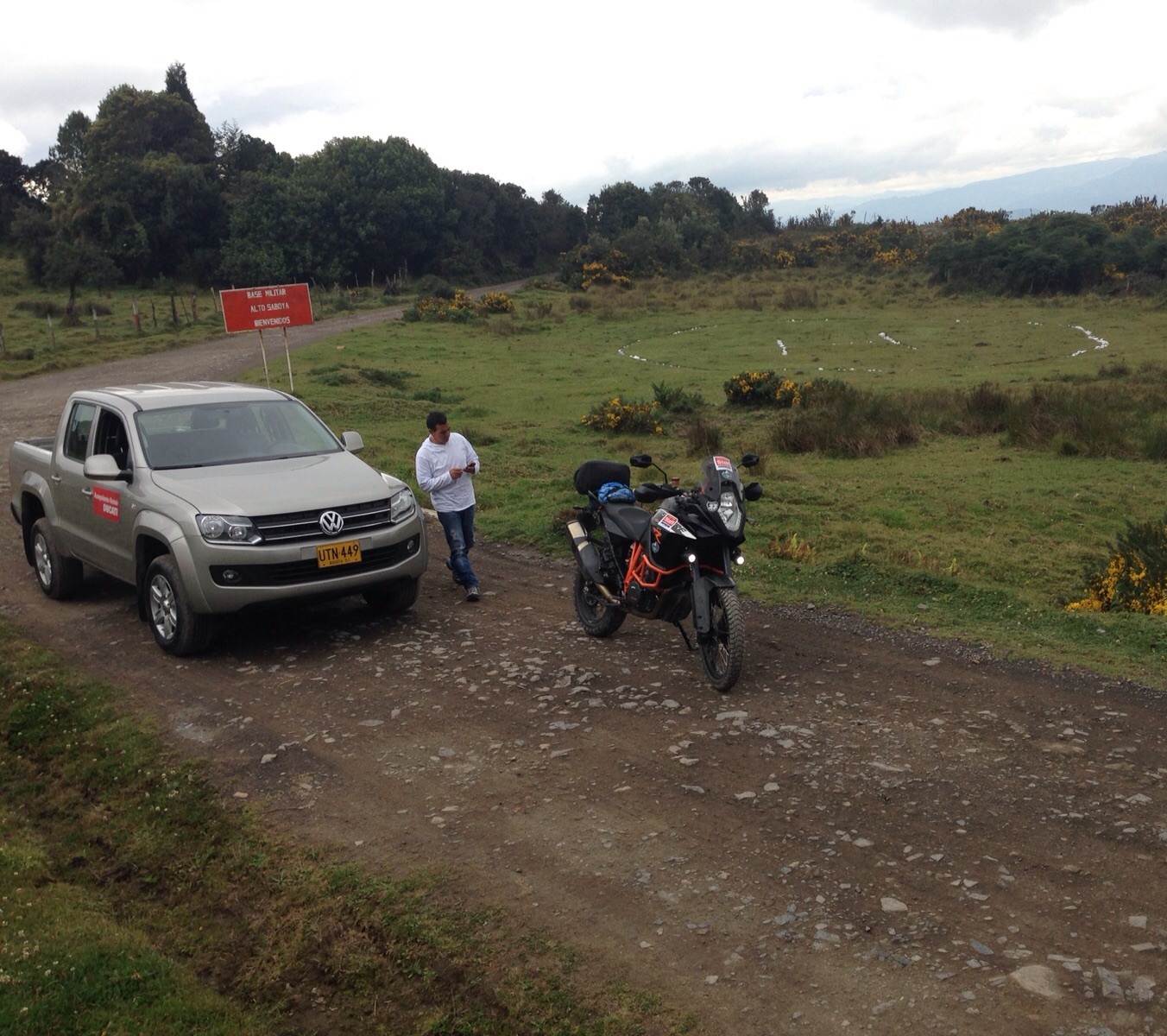 Antes de empezar las labores propias del enduro en terreno destapado, hacia las 11 de la mañana, habíamos superado algunos problemas menores de dos pilotos: 1. Una pinchada descomunal, solucionada con el «moño de tacos, tipo retroexcavadora» según las palabras del operario del montallantas. Realmente era el moño mas exagerado que uno pueda imaginar. Lamentablemente solo sirvió a medias, por raticos, pues esa llanta siguió dando lora todo el día. Finalmente podemos decir que despues de muchas cirugías y esfuerzos se portó bien pues trajo a su dueño de regreso.