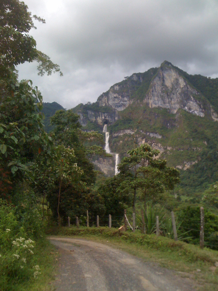 Ya estábamos ahí … Que mas podíamos hacer ? Bajamos al pueblo, Florián, con la idea de ver desde el otro lado como sale la cascada por la ventana y buscar el retorno por otra ruta. Pero la vista de la caída de agua que se muestra arriba, lamentablemente nunca se vió, porque ya la neblina estaba espesa. (Esa foto fue tomada en un viaje anterior, con mas invierno, mas volúmen de agua en la quebrada y un día mas despejado). En el comando de la policía en Florián nos dieron pésimo informe de la salida por Pauna, carretera en peor estado y un río que se debe vadear estaba crecido, motivo por lo cual decidimos volver sobre la misma ruta utilizada en la mañana para llegar.