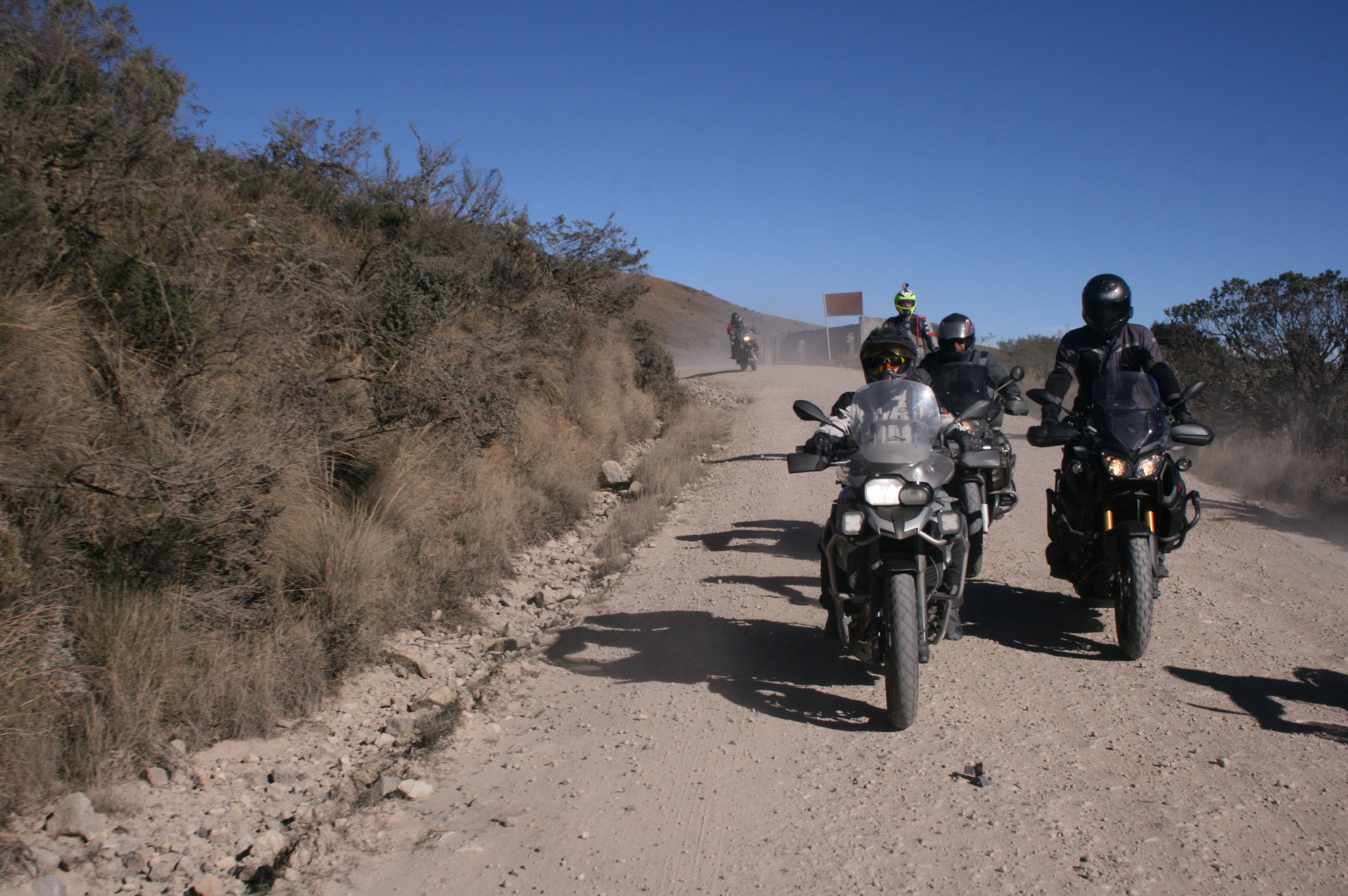 Igualmente, la carretera presenta unos despistadores tramos cortos de asfalto que permiten a los pilotos y muy especialmente a sus acompañantes femeninas, tener un descanso de la vibración propia del destapado y de la tierra-polvo que ya llevábamos en chaqueta, pantalón, casco, cara… En todos lados !!