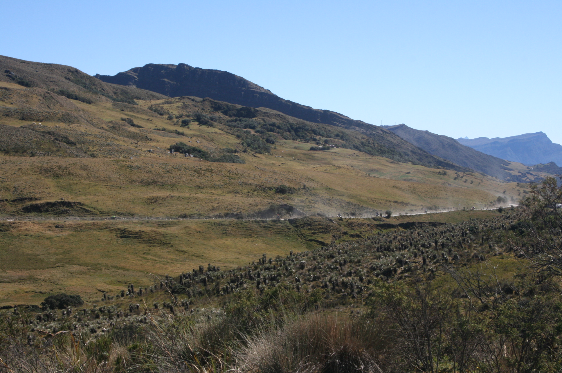 Con solo cruzarlo, la carretera empieza a subir serpenteando por una zona rural de minifundios y pequeñas fincas que se confunden con bosques de pinos y eucaliptos. Paramos para una primera reagrupación en la represa de la Regadera, que abastece el agua de buena parte del sur de Bogotá. Lastimosamente acá debieron devolverse dos amigos, por un incidente con un perro que dejó maltrecho al piloto (y al perro, supongo yo…).