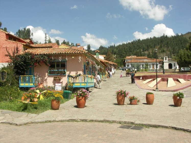 Es una replica miniatura de un pueblo boyacense colonial, con calles empedradas, sin tráfico interno, en donde se han asentado restaurantes de comida típica, almacenes de artesanías, cafecitos de postres variados, un hotel, un SPA (no muy colonial, creo yo) que ofrece turco, sauna, piscina y masajes, pero en fin, todo busca que el turista se sienta a gusto por un día o bien por un fin de semana.