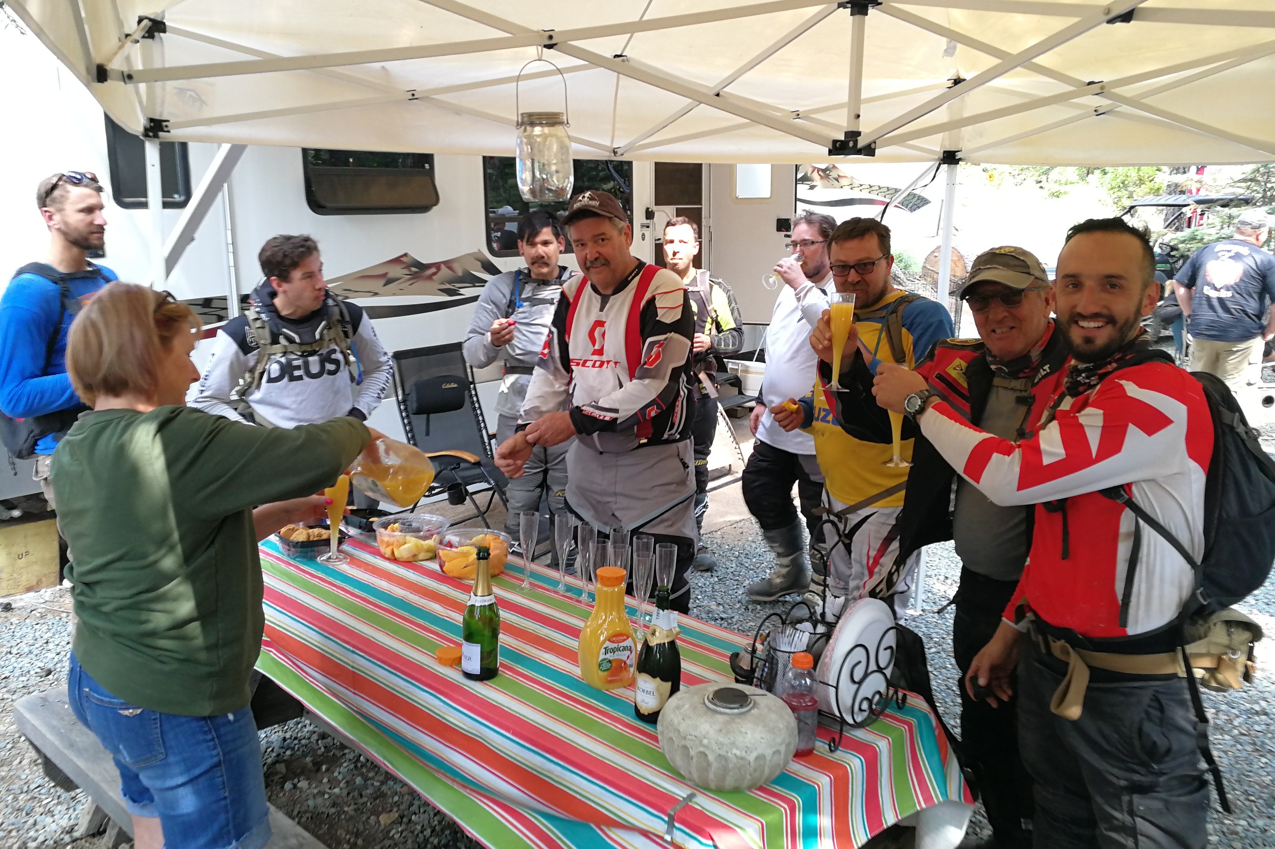 La salida la programa en esta época, final del verano, con un clima muy agradable para este tipo de evento. Solo recibe un grupo de 10 pilotos en total, incluido él mismo. No quiere crecer mas, pues eso complica mucho el asunto. Organiza todo con lujo de detalles: la ruta, las paradas, las comidas, el hotel… Su mujer, Christine, es una entusiasta que lo apoya en todo, con mucho talante ejecutivo gerencial. Son muy prácticos. Nos tenían excelente comida, pasta con salsa boloñesa para unos y carbonara para otros mas vegetarianos y unos tragos espirituosos o cervezas para compartir e ir conociéndonos mutuamente. Al día siguiente, a las 6:00 AM ya nos tenía el desayuno listo: Un self-service de huevos duros, cafe, jugo, quesos, panes y tortas… de todo!!