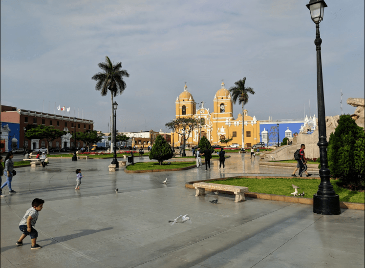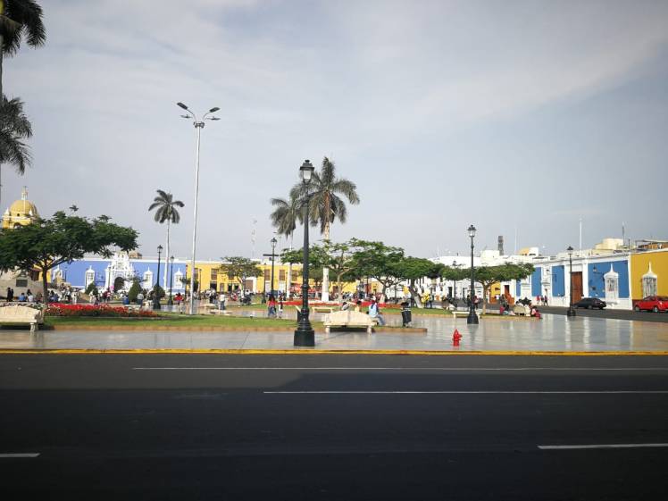 Similarmente, al llegar a Trujillo notamos como se ha deteriorado el tráfico y llegar a la Plaza de Armas en el centro histórico de la ciudad es hoy una proeza. Los choferes urbanos son una calamidad. Buses, colectivos y taxis por montones peleando por un pasajero pues también son colectivos estilo «Uber Pool» como en Piura, se atraviesan de un lado a otro sin mirar y sin ningún recato cierran buses, camiones y particulares. Como el plan del día era solo dar una ojeada a su famosa plaza y a continuación seguir a las playas de Huanchaco, en medio de ese despelote los hijos se preguntaban si valdría la pena ese esfuerzo. Finalmente creo que valió. El edificio de la municipalidad, el de la gobernación y el colorido mismo, hacen de esta plaza un lugar emblemático. Creo que ellos finalmente nos dieron la razón. Igualmente, el caso de desespero adicional al tráfico para llegar, era ya un asunto de hambre. Cuatro de la tarde y sin almorzar. Afortunadamente encontramos un lugar delicioso que a punta de «Causa Limeña», «Sanguche de Fonzi» y «Lomo Saltado» con unas Cusqueñas nos devolvió el alma al cuerpo.