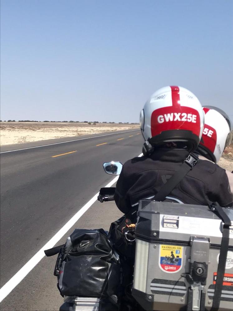 Nos llamó mucho la atención las ventas continuas de miel de abejas, sobre la carretera y en los escasos centros urbanos que pasamos. Son muchos puestos. Y en una parada posterior, en medio del desierto y de la nada, donde solo se ve una rala y escasa vegetación de maticas pequeñas, en pocos minutos sentimos que sobre las motos y las maletas laterales aparecían abejas curiosas indagando por algo dulce. De donde salen? De qué viven?