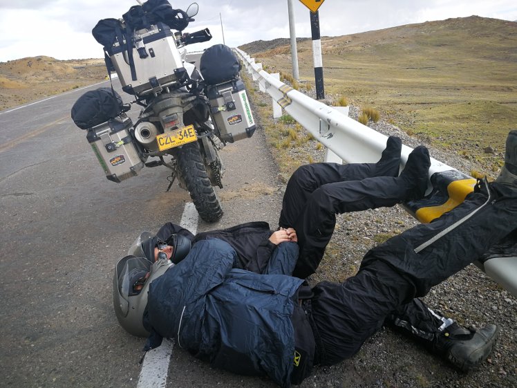 La experiencia de subir de nivel mar a mas de 4.300 metros en pocos kilómetros es de las cosas mas desagradables si además no se toman las medidas o infusiones apropiadas y no hay cierta experiencia. Agregar a ello frío y lluvia, lo hace peor. Y eso no solo para uno. Imagino que la moto de Catalina es carburada y si es así debe haber batallado con la combustión de la moto, que si bien igual rueda, es como ir montada en un caballo tosiendo y estornudando.
