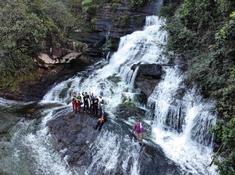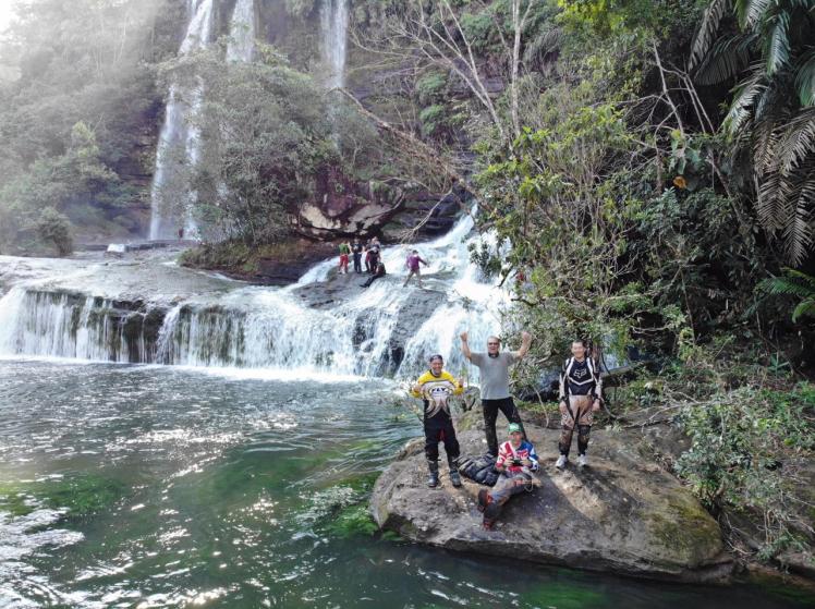En el segundo día comenzó lo bueno. Todo en destapado, por trochas. Contratamos los servicios de dos guías, Pedro y Fernando, en sus propias motos, pues es una ruta complicada y exigente. Muy recomendables, cuando quieran ir por allá. Uno indicaba el camino a seguir y otro cerraba el grupo ayudando en los percances. Hacia las 2:00 PM almorzamos en Yarumales, donde nos esperaban otros guías locales. Son éstos otros guías adscritos y preparados por parques nacionales, quienes nos llevarían a caminar por Caño Canoas. Es obligatorio contratar con ellos la guianza en las caminatas. Como es de suponer, comprobamos con satisfacción que nuestros amigos moteros tenían MUCHA razón cuando nos aconsejaron esta ruta. Los dos caños son de una belleza indescriptible. Cada uno en su estilo. Ambos tienen aguas muy claras, limpias, frías, que escurren desde el páramo de Sumapaz. En el primero, Canoas, NO encontramos las características plantas de colores (Macarenia Clavíjera) que son el atractivo principal de Cristales y Siete Machos. Pero Canoas compensa ésta carencia con unas cascadas de ensueño. Noten los efectos de las fotos tomadas con el dron de @pistaselreto :