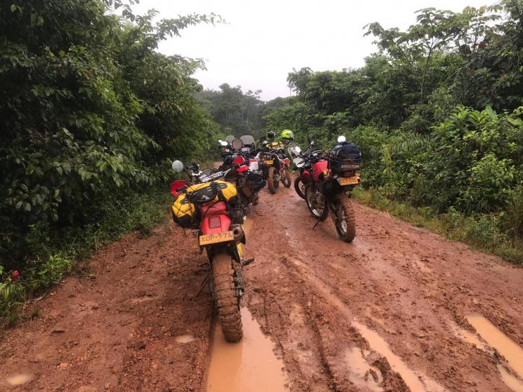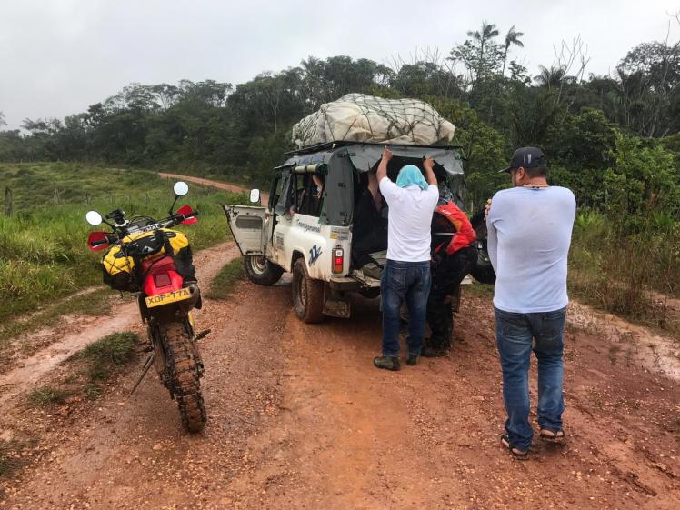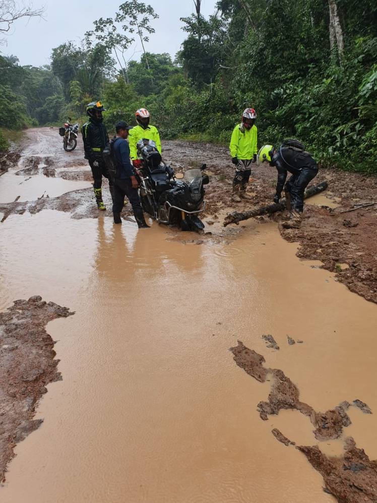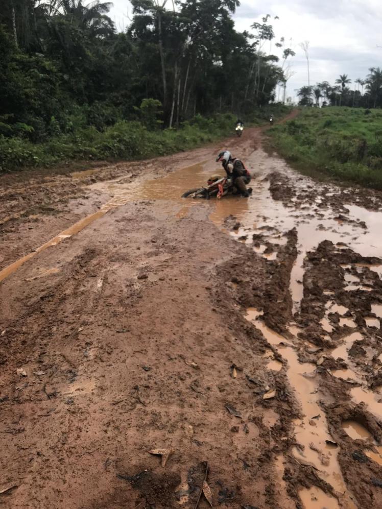 Uno olvida con facilidad los golpes que se ha dado en las diferentes y múltiples caídas, que normalmente no son graves. Son resbalones a baja velocidad que, en general, intentamos justificar para ocultar nuestras propias falencias de manejo. Es cuestión de no dejar golpear también el ego… Pero realmente si intervienen el cansancio, el barro/greda pegados en las llantas y el gran peso de las motos que vienen muy cargadas con todo: lo normal de mudas de ropa, herramientas para cualquier eventualidad, pinchazos, equipo básico de emergencia por si tenemos que pernoctar en el camino que comprende lo básico, algo de comida y líquidos, hamaca, mosquitero, etc.