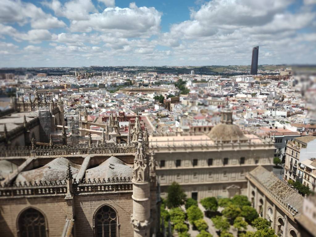 De ésta forma, en la tarde caminamos Sevilla por todos lados, siguiendo instrucciones precisas de nuestra recepcionista del hotel. En particular, caminamos por la rambla a orillas del Guadalquivir. Es, sin lugar a dudas, una ciudad muy sabrosa de caminar: Todo muy plano, nada comparable a Granada y sus lomas. Por éstas mismas razones, teníamos al otro día ya reservado y “con anterioridad” un tour a pie en el que incluíamos la enorme Catedral de Sevilla. Con sus espacios absurdamente grandes, el tour incluía subida a La Giralda (torre del campanario). Desde luego iríamos a continuación al famoso Alcázar de Sevilla, otro palacio icónico del mundo español-árabe-nazarí. Pero volviendo a la primera etapa de este tour, para darse una idea de magnitud de La Giralda, ésta torre tiene más de 100 metros de altura, tiene 25 campanas y llegó a ser por varios siglos la torre más alta de Europa.